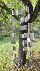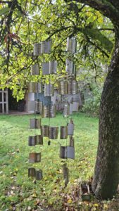 Der Glanz des Dosenblechs im Spiel des Windes hat mich gepackt. Zur Hälfte aufgeschnittene Dosen werden mit Draht zu Flügeln zusammengesetzt und mit Bändern verbunden. Alles dreht sich, alles bewegt sich umeinander im Wind.