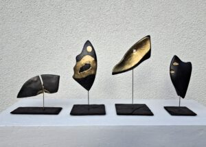 Von meinen Betonmasken sind die Scherben der Gipsformen übriggeblieben. Abfall oder Kunst? Nach etwas Bearbeitung eindeutig „schön“.