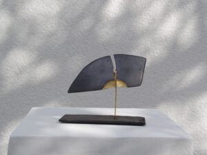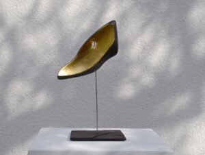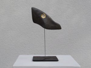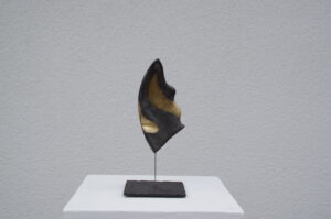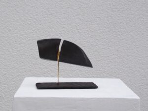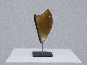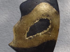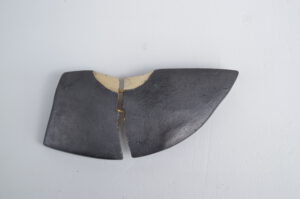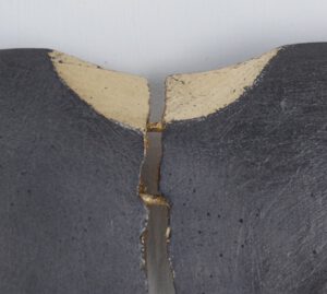 Beim Schleifen ist die Form zerbrochen. Aber mit zwei goldenen Nägeln wird ein Ganzes daraus. Die Bruchflächen sind mit Blattgold belegt.